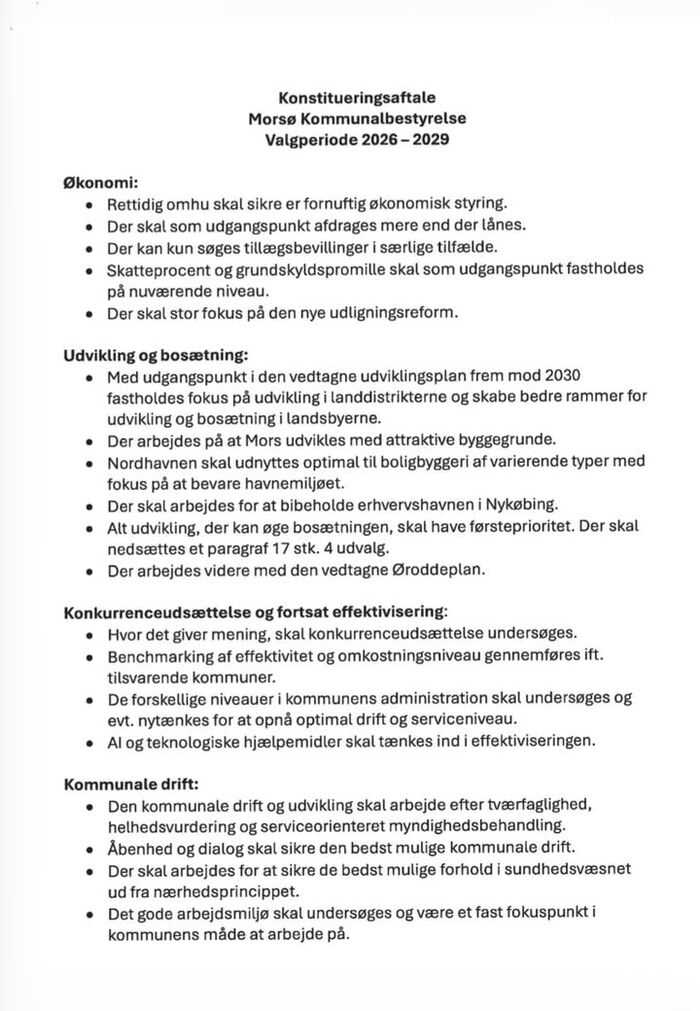 Den nye konstitueringsaftale for Morsø Kommune er nu offentliggjort, og Venstre opfordrer alle morsingboer til at læse den.